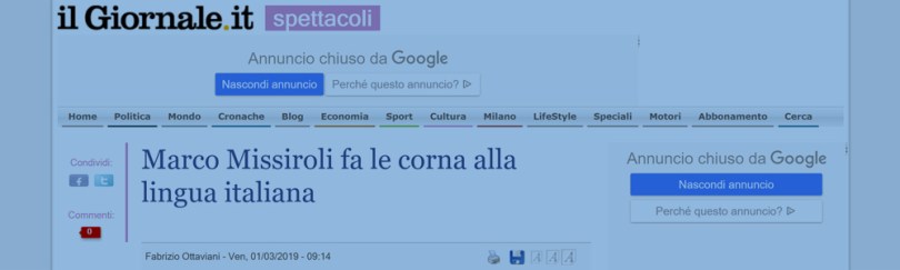 Corre l’obbligo, amici lettori, di tornare sul bel romanzo di Missiroli per dare risposta all’ immeritata stroncatura di Fabrizio Ottaviani pubblicata su Il Giornale il primo marzo, con il titolo “Marco Missiroli fa le corna alla lingua italiana” e facilmente reperibile on line. È opportuno innanzitutto soffermarsi sul tema. Quello che viene definito “il tema